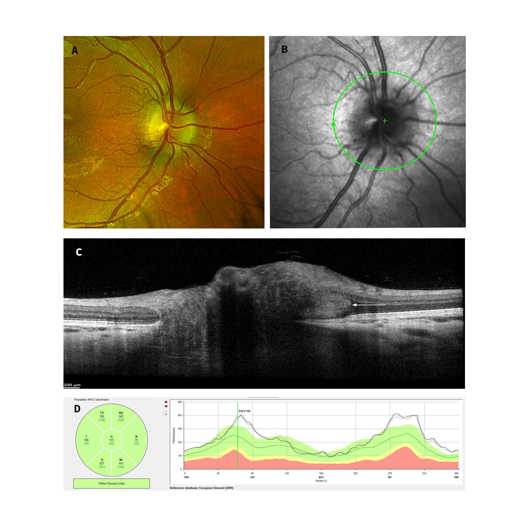 Fig 2: Pseudopapilloedema in an asymptomatic seven-year-old child. A: Optos ultra-widefield fundus photograph demonstrating blurred disc margins. B: En-face Heidelberg OCT image of optic disc. C: Heidelberg optic nerve head image demonstrating PHOMS (white arrow), which remained stable over a six-month period of monitoring. D: Heidelberg OCT retinal nerve fibre measurements demonstrating higher than average thickness which remained stable over a six-month period of monitoring