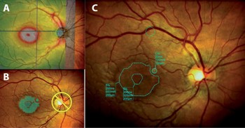 Fig 1A. An OCT thickness map is imported to the Navilas system and automatically registered and overlaid onto to a live fundus image. B. Treatment planning is done on a touch screen and laser treatment is delivered using real-time eye-tracking. Areas of the fundus, in this case the optic nerve, can be marked as no-go areas for the laser. A titration spot at the arcade is used to calculate an appropriate subthreshold power setting. C. At the end of laser treatment, an image is captured and a summary documenting areas of threshold (laser uptake visible) and subthreshold (no visible uptake) areas of treatment is produced